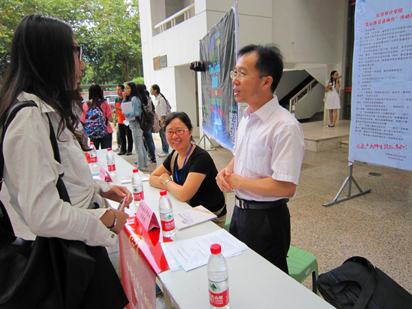 推普活动现场,为盲人诵读公益活动录制台、语言艺术咨询台、语言文字知识咨询台、普通话水平模拟测试台、南京审计学院朗诵协会报名处及横幅签名工作台,可谓是形式多彩、气氛热烈,吸引着大量前来报名、咨询、诵读的大学生们。现场13名测试员放弃休息时间,热情、耐心、细致地为每一位参与活动师生答疑,充分体现了我校测试员队伍凝心聚力、敬业奉献的团体品质。
