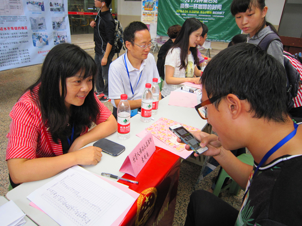 在活动现场,校领导王会金、时现、裴育副校长及教务委员会程乃胜主任、鲁靖副主任,详细地了解着活动内容,并再三叮嘱学校语言文字及推普工作的重要性,他们此次推普宣传周活动表示高度赞扬和大力支持。同时,领导们也积极地走到“普通话—南审校园语言,规范字—南审校园宣传”横幅签名处,和在场的广大师生一样,坚定地签上自己的名字。签名处留下上百人的姓名笔迹,都表明签名者今后在校园里学习普通话、推广普通话的信心和恒心;在为“盲人诵读公益活动录制台”附件,竟然排起了长队,大学生们纷纷拿出手机,扫描“为盲胞读书”公众号二维码,在测试员老师的指导下,录制有声音频向盲人朋友传递爱心;更多对普通话水平测试感兴趣的同学,涌向现场的测试员老师,纷纷请教普通话的相关知识及测试中的技巧,并现场参加普通话水平模拟测试。语言艺术咨询台及校朗诵协筹备会报名处,也吸引了众多热爱语言艺术的大学生们,他们不由地表达了期望学校提供学习语言艺术及锻炼平台的愿望。活动现场的宣传展板,更是详细地向广大师生介绍了学校对教职工、大学生普通话的要求及学分上的奖励细则,让更多的师生认识到普通话是提高自身素质的重要途径。