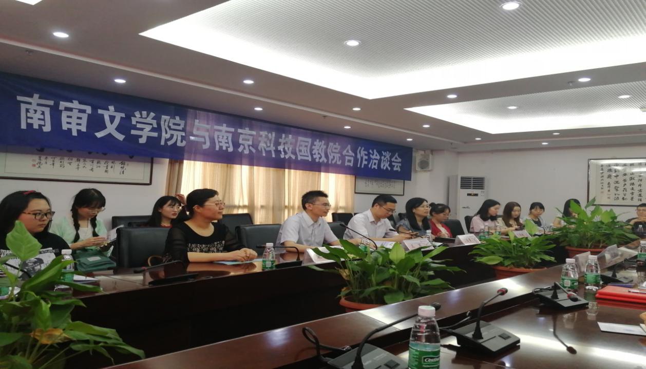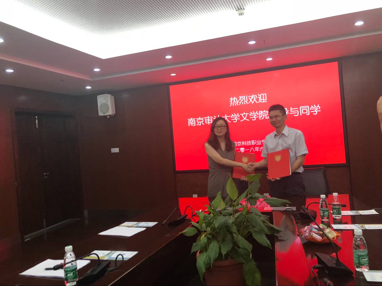 2018年6月8日下午,在校教务中心副主任丁国勇和missav 副院长王军的带领下,missav 汉国教系主任栗学英、副主任丁存越与十几位学生前往南京科技职业学院参观,在热烈友好的气氛中,南审missav 和南京科技职业学院国教院正式签订了实习基地协议。