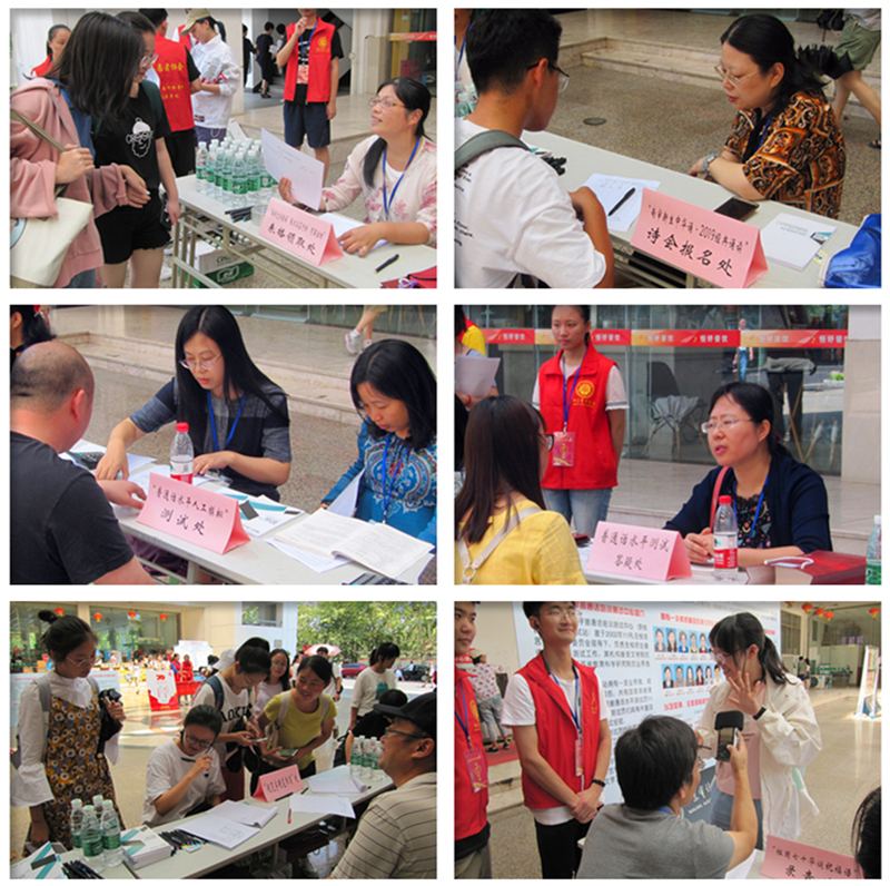 9月18日中午,由我校11名国家级、省级测试员组成的推普队伍,在沁园食堂一楼大厅为前来咨询的师生们热情服务。测试员老师们放弃午间短暂的休息时间,通过“共和国七十华诞祝福语录音正音”、“硬笔规范字书写”、“普通话水平人工模拟测试”、“语言文字及普测知识答疑”、“新生中华诵·2019经典诵读”诗会现场报名”、“校园文字‘啄木鸟在行动’”等活动方式热情、耐心、细致地为每一位前来参与活动师生答疑、服务,校学生会18名推普志愿者也参与到活动中,在现场向来往的师生们宣传推普活动,充分体现了我校推普队伍凝心聚力、敬业奉献的团体品质。