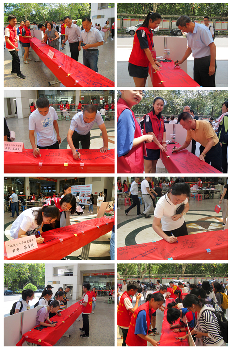 活动现场,校语委主任董必荣副校长;程乃胜、刘顺副主任对我校语言文字及普测中心工作进行了详细的了解和指导,同时,对校园推普宣传周活动表示赞赏和支持,领导们也积极地走到“中华人民共和国成立七十华诞祝福语签名台 ”像其他在场师生一样,真挚地写上自己对共和国七十华诞的祝福语并签上自己的名字。来到签名处的还有著名书法家刘建平教授及广大师生,大家纷纷书写着“我爱你.中国”、“祝福祖国繁荣昌盛”、“共和国万岁”等祝福留言,签名横幅上留下了几百位师生的姓名笔迹,表明了签名者对祖国真挚的情感和对普通话是校园最美丽的语言这一倡导的支持!