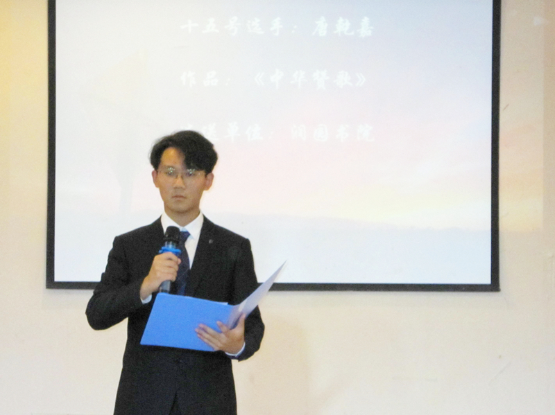 经过激烈比赛,在个人项目中,润园书院唐乾嘉同学以自创诗歌《中华赞歌》获得个人项一等奖;沁园书院张钰琦《满江红》、润园书院周彦泽《蜀道难》获二等奖,其他10名选手分别获三等奖、优胜奖。
