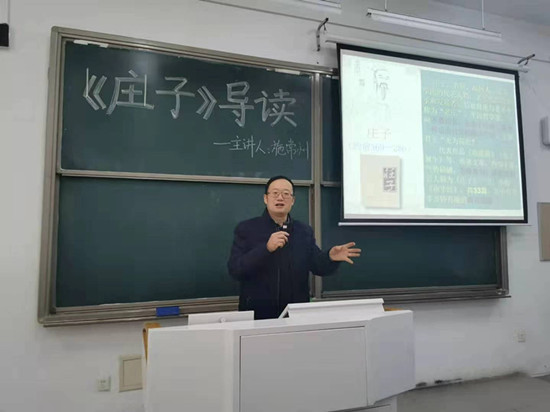 最后,施常州鼓励同学们静心体悟“庄学”主张的安命无为、游心逍遥、斋心坐忘:今日社会中,物欲横流,人文精神失落,人的“精神家园”被挤占侵吞,很多人迷失道路方向而不知所措。怎么办?今天的讲座提醒我们,要回头看看古人,看看庄子,学习庄子。我们曾经失落的精神世界还可以寻找回来,因为传统文化中有很多庄子这样的哲学和文学大师,阅读他们的作品,他们的思想精神和智慧人格的光芒,就会穿越时空,照亮我们前进的道路!
