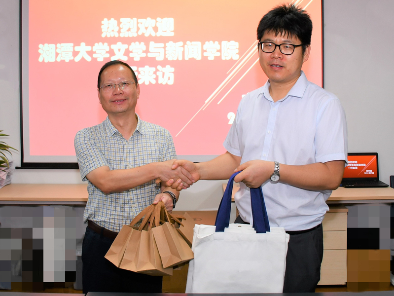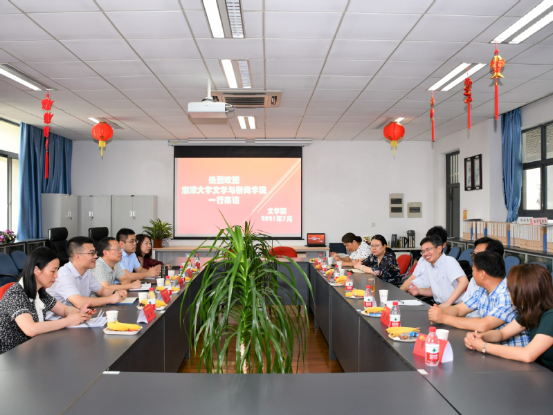 7月7号下午,湘潭大学文学与新闻学院雷磊院长、资义平书记、宋德发副院长、刘晓丽副院长和田华副院长等人应邀来我院进行学科调研与交流活动。此次活动由missav 副院长朱军教授主持,missav 刘顺教授、王军书记、洪涛副院长、龚玉兰副院长等人参加。