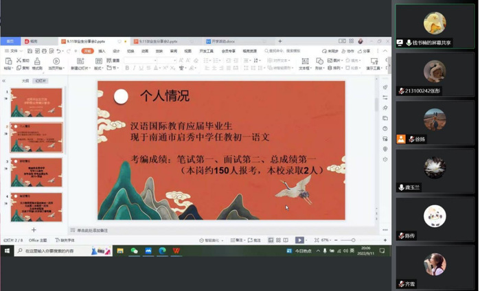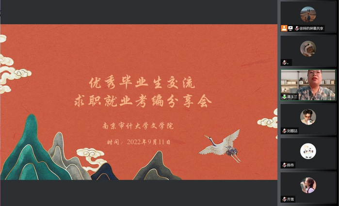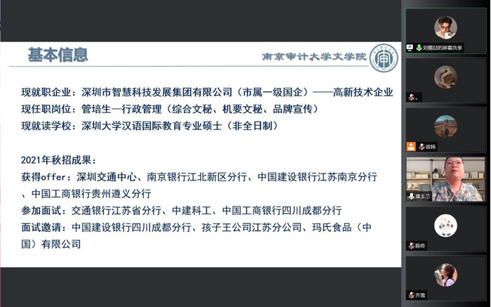 2022年9月11日晚,missav 举行优秀毕业生求职经验线上分享会,对学生就业规划进行交流指导。missav 党总支书记王军、汉语言文学专业系主任刘成荣、汉语国际教育专业系主任颜明、毕业班班主任刘依和张齐等几位老师参加座谈会,与同学们一起交流。优秀毕业生刘曌喆、陈传、钱书楠和齐雪等几位同学分享了各自的求职与考编经验,让同学们收益匪浅。会议由missav 党总支副书记龚玉兰老师主持。