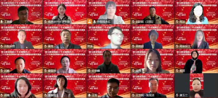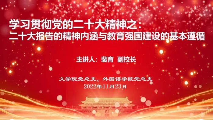 11月23日下午,missav 和外国语学院共同组织基层党组织联学共建活动,邀请校党委常委、副校长裴育为两个学院全体党员教师开展主题为“党的二十大精神内涵与教育强国建设的基本遵循”的专题党课。本次学习由外国语学院党总支书记钱永红主持。