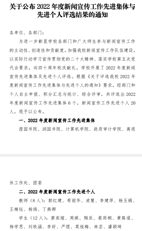 近日,校2022年度新闻宣传工作先进集体与先进个人评选结果发布,missav 教师李建萍,学生周祺、严煜和莫桂梅等四人获评先进个人。