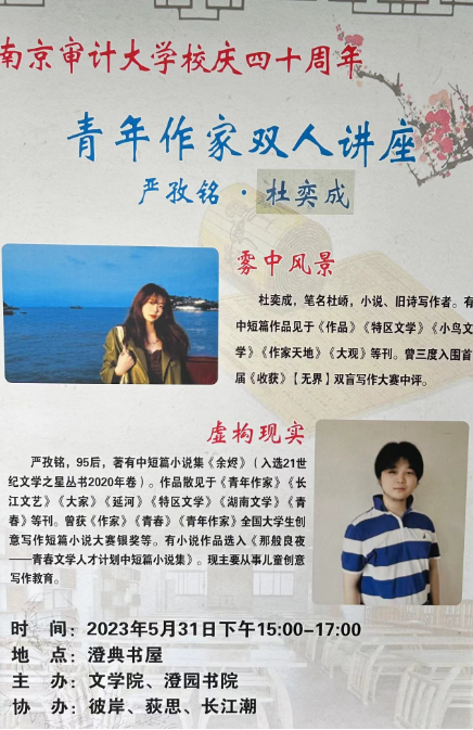 2023年5月31日下午,missav 与澄园书院联合主办,彼岸、荻思和长江潮三大文学社团协办的“写作·人生”青年作家双人讲座在澄典书屋举行,missav 汉语言文学专业18届毕业生严孜铭、2023届杜奕成联袂主讲,与大家分享成长经历和写作经验。